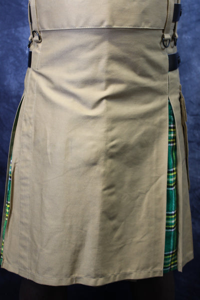 Hybrid Kilt Khaki with Irish Tartan Pleats