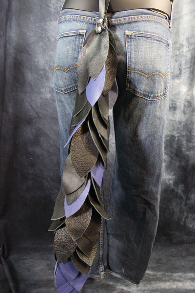 This hand crafted Wolf Tail is available in a variety of colors. It is made of overlapping leather fronds for fluffy appearance rarely seen in leather as well as a fluid swish when you wag!