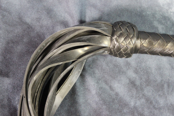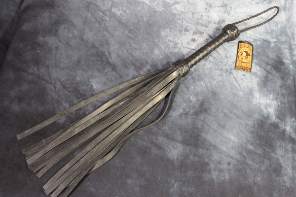 NOTE: These floggers come in 2 varieties, one with a braided leather handle and one with a braided RUBBER handle!!! (Kinky AND vegan!)