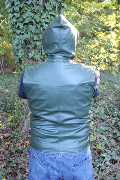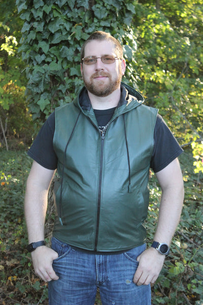 Show off your arms while staying snug with this fantastic Otter and Fox product, now available in a variety of options! Made out of the softest garment leather and lined for your comfort, these amazing hoodies are great to wear year round. This sleeveless hoodie is modeled after popular work out gear to give you that hot gym body look while indulging your love of leather