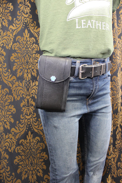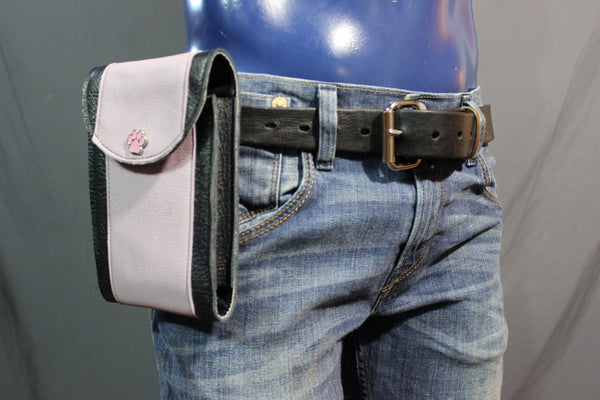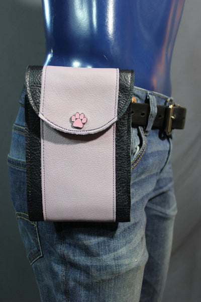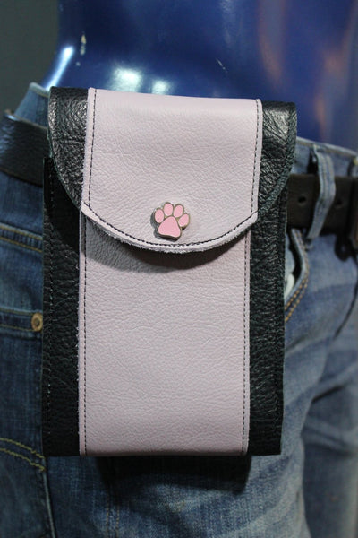 This beautiful handmade leather cell phone case is customized to hold most standard Phone and Android models in the colors of your choice with a variety of puppy paw hardware finishes! A snap closure keeps everything secure, and the holder slides neatly onto your belt with a solid metal clip.