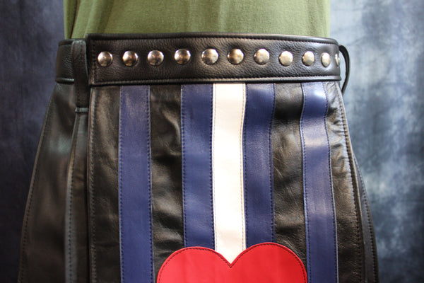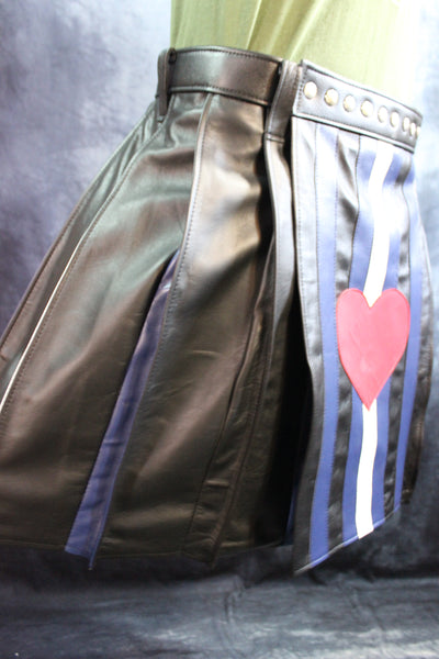 Celebrater your leather pride with a custom, hand crafted kilt! This lambskin kilt features the Leather Pride Flag on the front apron, plus the flag colors worked into the pleats.